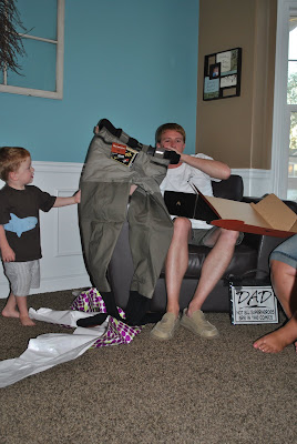 For Spence's birthday this year, he didn't want me to have a party. We showed him- we went to dinner with my family on Saturday, and had his parents and the girls over for dinner Sunday, and celebrated even more on Monday by bringing treats to work in the morning. Sunday is the only day I had my camera though. He wanted a cheesecake dessert my mom makes instead of a cake so we had that and opened presents.